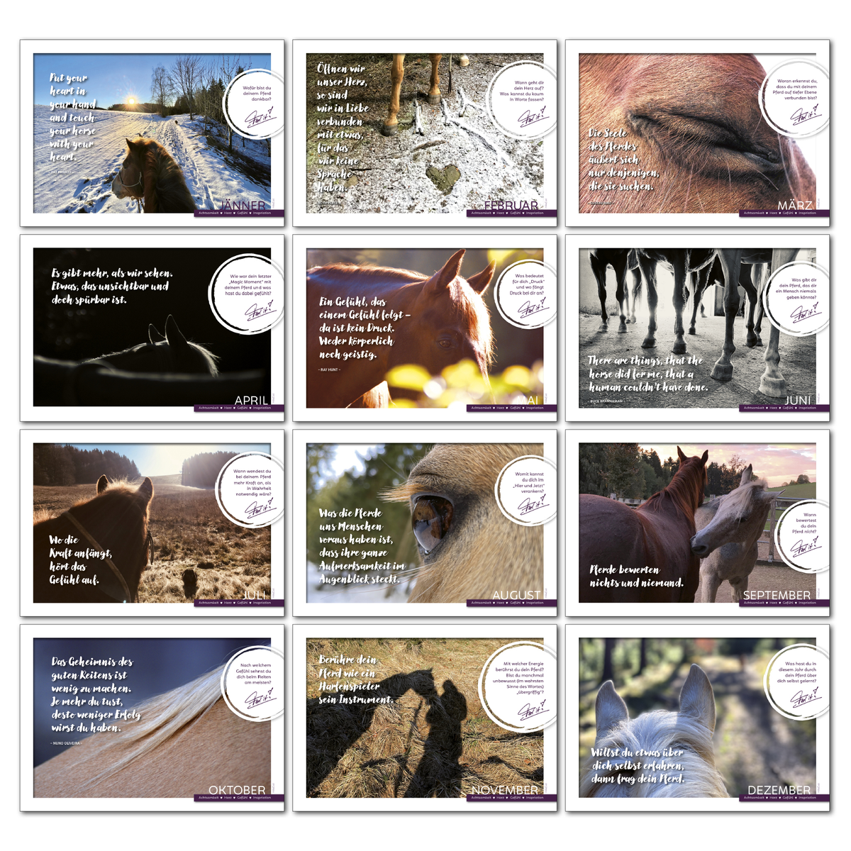 Wandkalender "Achtsamkeit mit Pferden" ist voller Pferdefotos, inspirierender Zitate und dazupassender Reflexionsfragen.